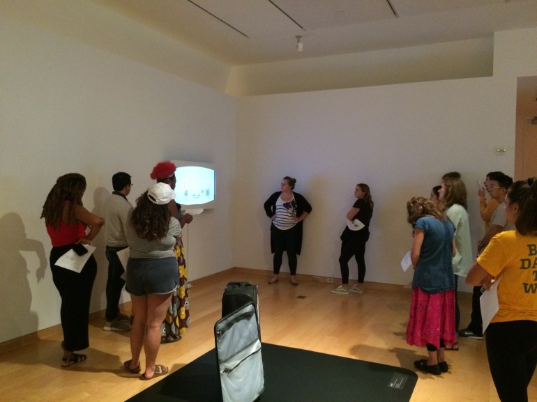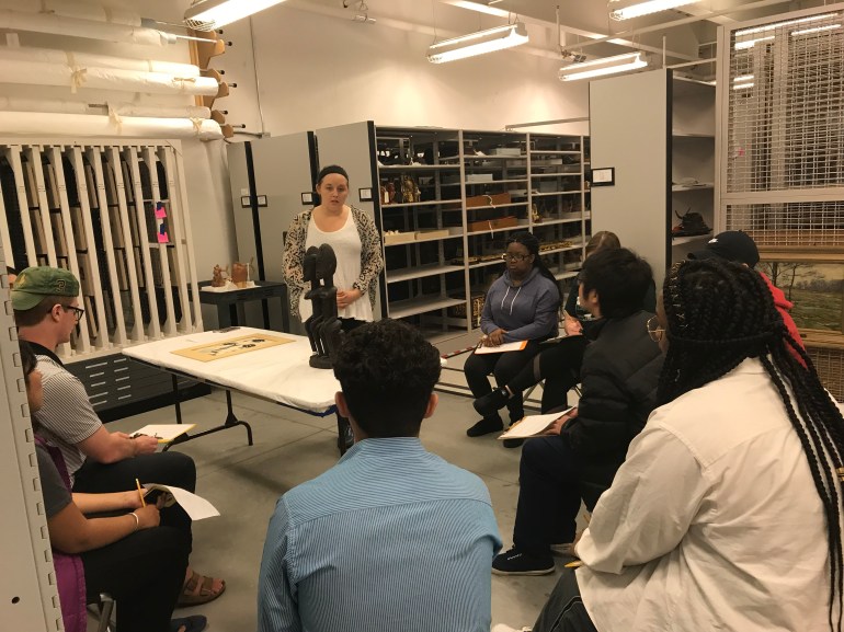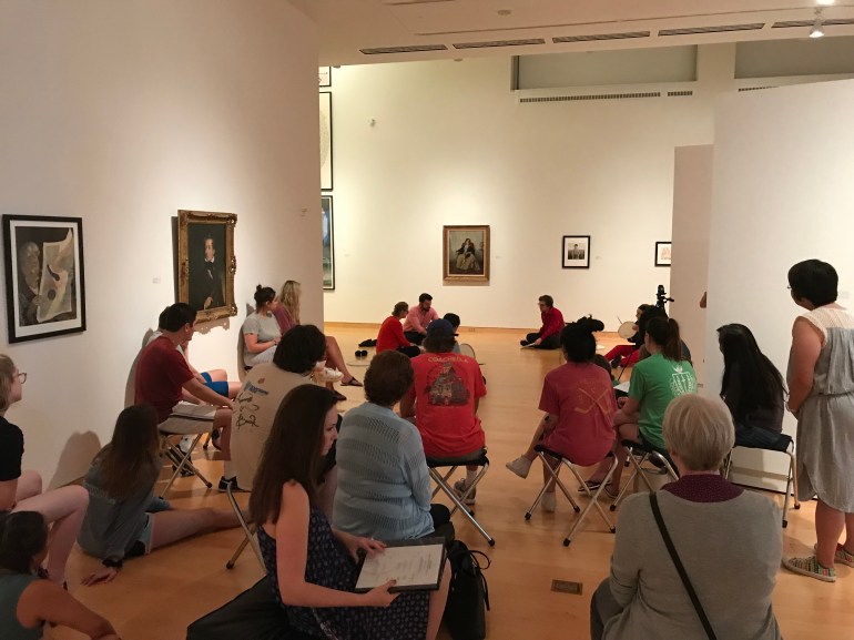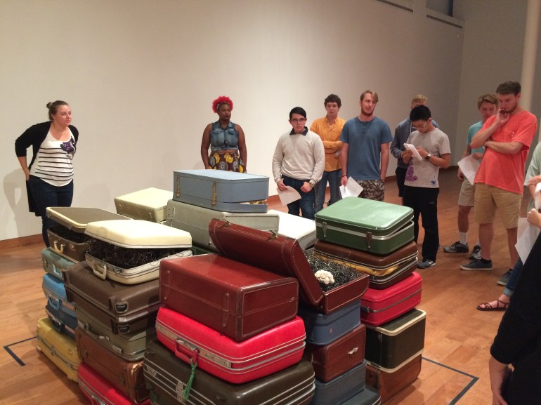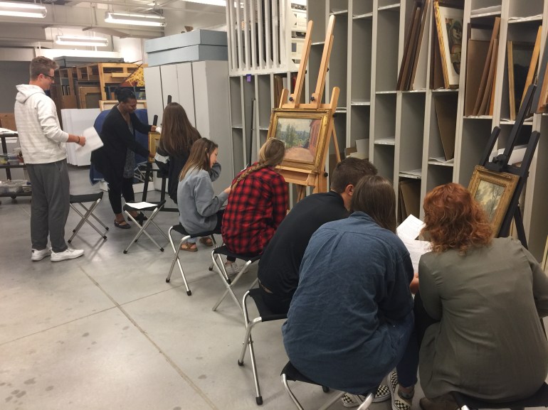For example, in the past, when I have worked with an Academic Excellence Seminar, I designed a class day in which we sit, together, in front of a work of art and students are encouraged to participate in discussion through the three main questions of Visual Thinking Strategies: what’s going on? What do you see that makes you say that? What more can we find? These open-ended questions allow for discussion based on prior knowledge and building up confidence speaking in the classroom setting. Through this method students realize the value of their contributions to academic discussions regardless of their prior knowledge and/or background.